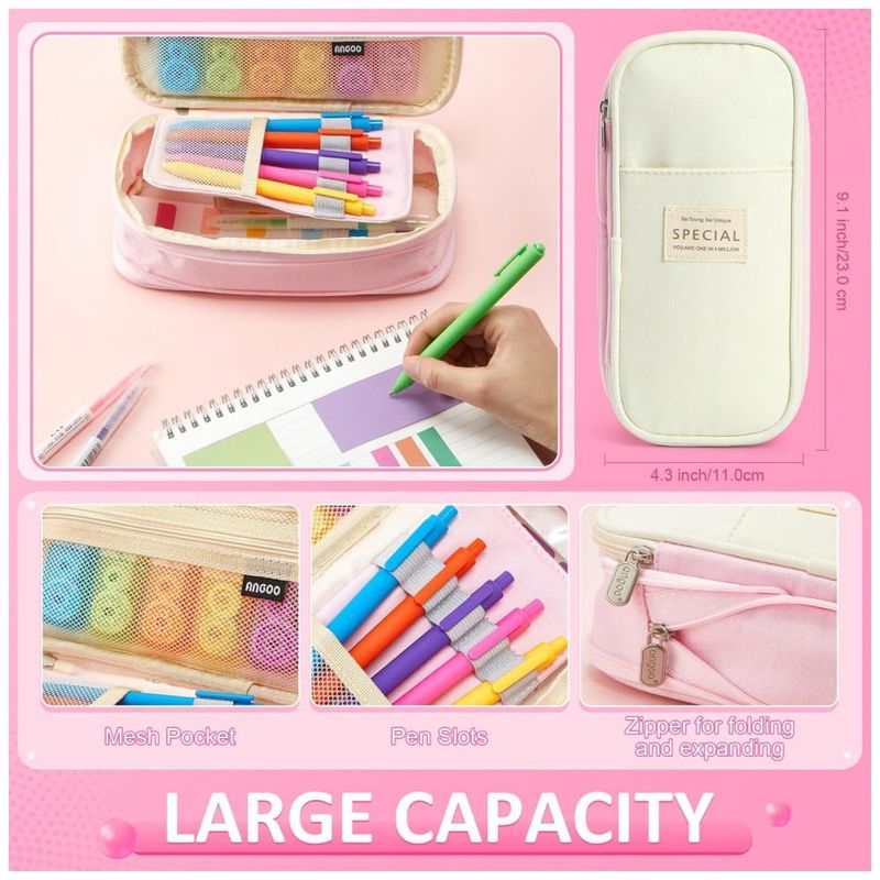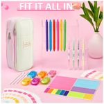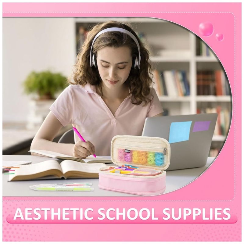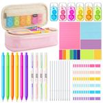 O kit escolar Janlaugh 38 peças em cores neon reúne estojo, canetas em gel, canetas retráteis, marcadores, fitas corretivas e blocos de notas adesivas em um conjunto voltado para organização de estudos, anotações e uso em ambiente escolar e universitário. O estojo em tecido poliéster possui zíper suave, bolso em tela e elásticos internos, oferecendo espaço para armazenar canetas, marcadores, refis e acessórios em um único compartimento de fácil acesso. A seleção de canetas em gel de tinta preta, canetas retráteis e marcadores de dupla ponta foi pensada para escrita contínua, marcação de trechos importantes e anotações em planners, cadernos e materiais de estudo.
