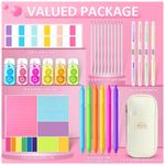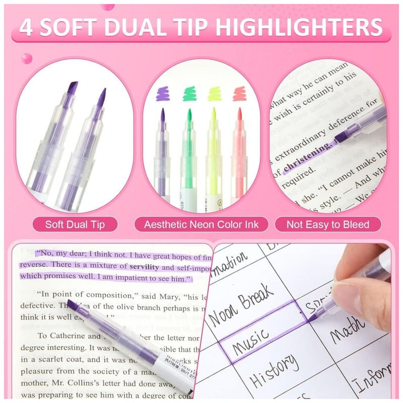 O bloco de notas adesivas com 330 folhas reúne tamanhos e formatos variados em paleta de cores suaves, adequado para recados, marcação de páginas, organização de tarefas e indexação de conteúdos. As fitas corretivas permitem correção rápida e limpa de textos manuscritos, sem necessidade de tempo de secagem, mantendo o caderno organizado. As canetas em gel pretas e os refis correspondentes fornecem autonomia de uso prolongado, enquanto as canetas marca-texto de dupla ponta oferecem traços finos e largos com tinta de alta transparência, que não cobre completamente o texto impresso.