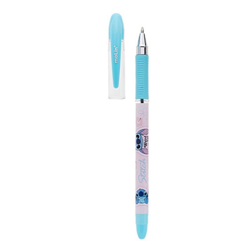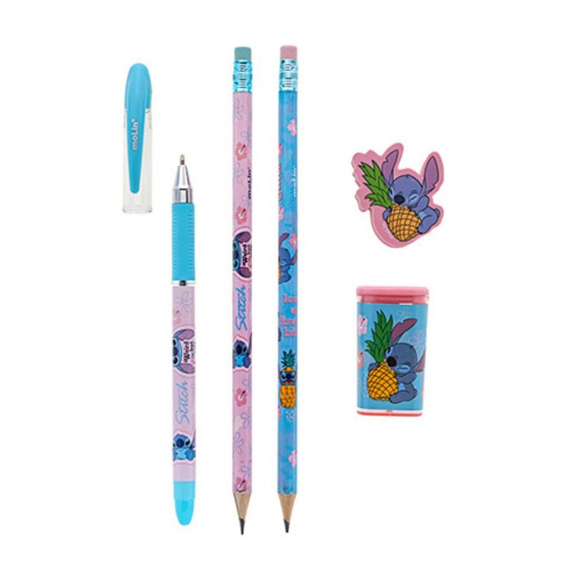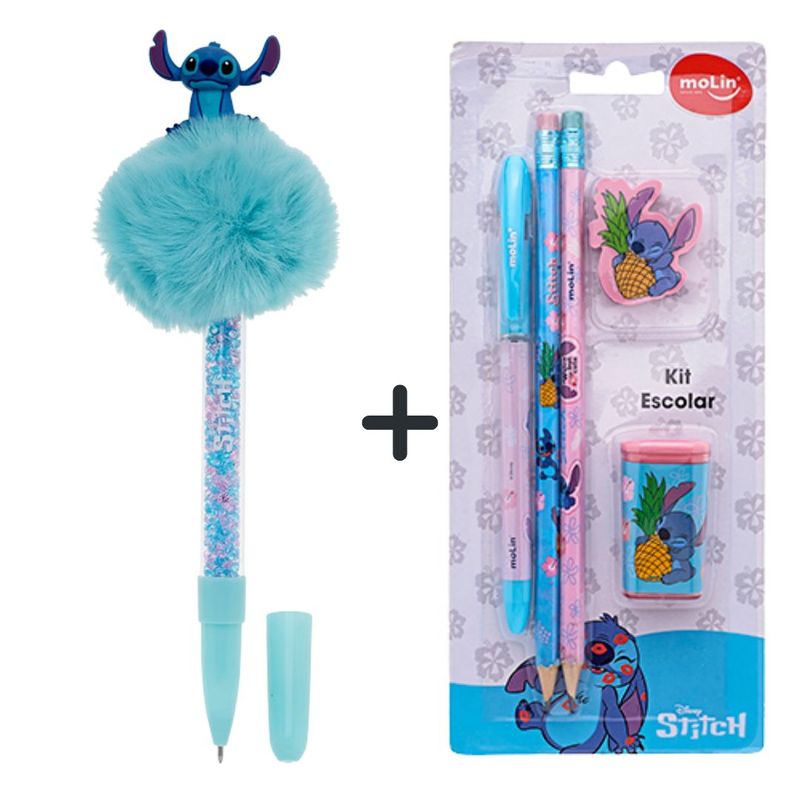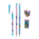 Contém: 1 caneta esferográfica (escrita azul), 2 lápis pretos HB, 1 borracha e 1 apontador com depósito + 01 caneta pompom Stitch.
