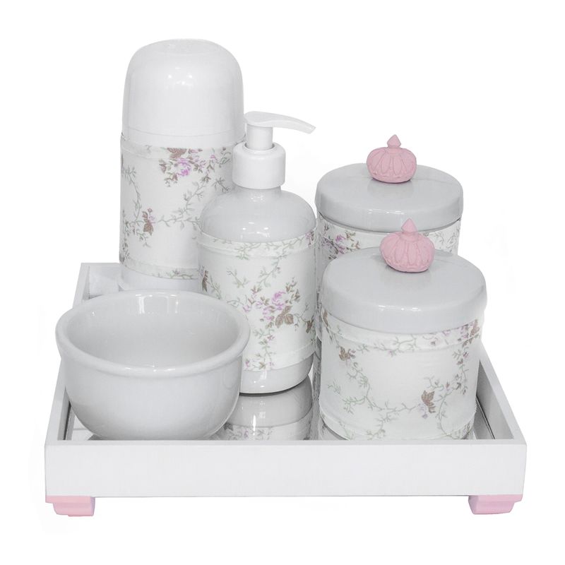 Kit higiene com bandeja de MDF em pintura branca com detalhe rosa, fundo de espelho e decoração com resinas de Coroa rosa nas tampas dos potes com capas.