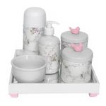 Kit Higiene Espelho Completo Porcelanas, Garrafa Pequena e Capa Passarinho Rosa