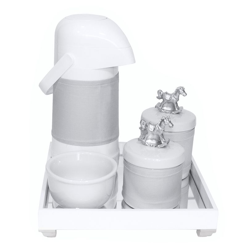 Kit Higiene Espelho Potes, Garrafa, Molhadeira e Capa Cavalinho Prata