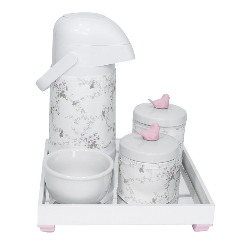 Kit higiene com bandeja de MDF em pintura branca com detalhe rosa, fundo de espelho e decoração com resinas de Passarinho rosa nas tampas dos potes com capas.
