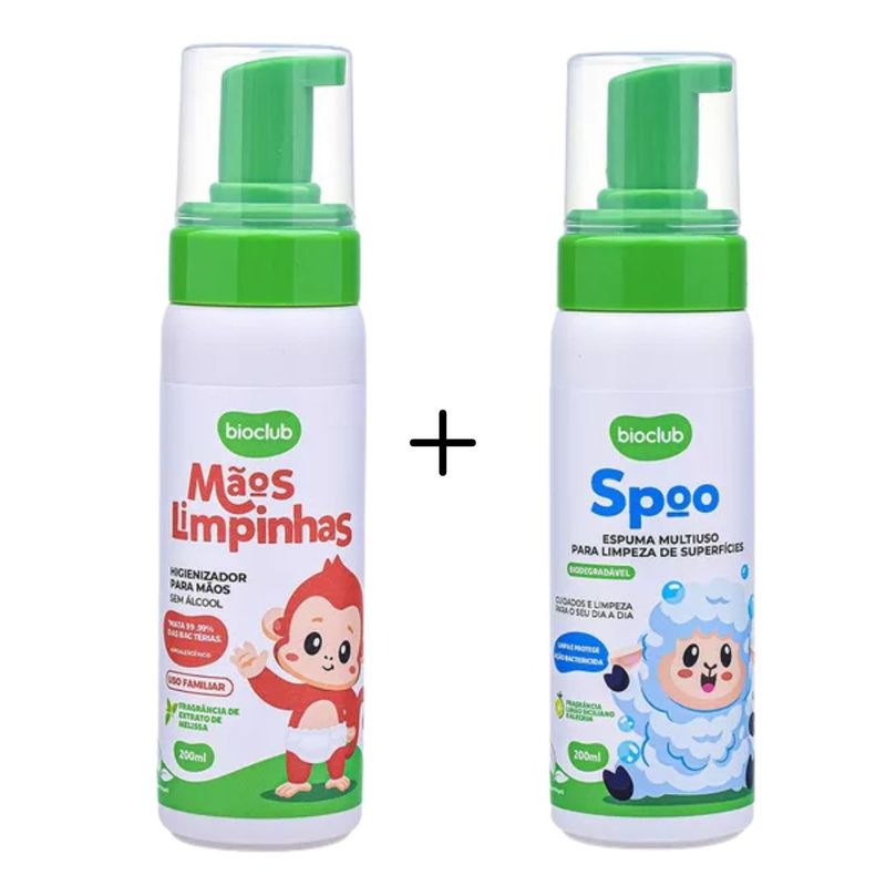 Contém 01 Higienizador Mãos Limpinhas e 01 Spoo Espuma Multiuso Natural Bioclub.