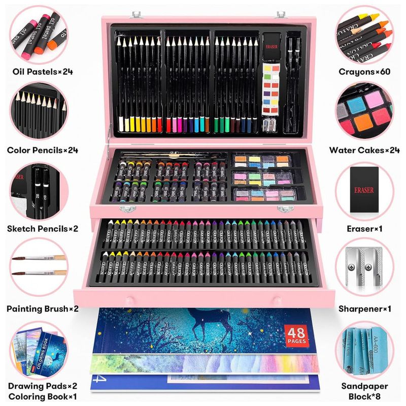 Suprimentos de arte suficientes Este conjunto de desenho Premium inclui 24 lápis de cor, 24 pastéis de óleo, 24 bolos de aquarela, paletas de 3x8 poços, 2 blocos de desenho, 1 livro de colorir, 2 lápis de desenho, 2 pincéis, 10 blocos de lixa, 1 apontador de lápis, 1 régua, 1 borracha, 60 giz de cera, 1 estojo de arte em madeira e caixa de presente. Eles são as melhores ferramentas para mostrar o incrível talento de alguém no desenho. Grandes conjuntos de arte para crianças pequenas que são iniciantes e exploram sua curiosidade