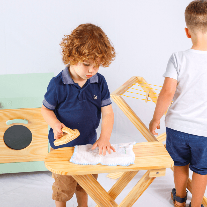 O kit lavanderia infantil é composto pela máquina de lavar roupa, pela tábua de passar e pelo varal. Permite à criança imaginar e criar narrativas e contextos de imitação da vida cotidiana e desenvolvimento de inúmeras habilidades. Prioriza o Livre Brincar, visto que não há regras específicas para que ela explore o brinquedo.