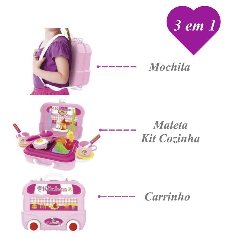 A Maleta pode se transformar em 3 coisas diferentes mochila, maleta kit cozinha e um lindo carrinho. Uma excelente opção para presentear e com certeza as crianças vão amar! O conjunto vem acessórios que permitem à criança se expressar, libertar os sentimentos, brinquedos de faz de conta servem como instrumento de estruturação do indivíduo e não trabalham apenas uma capacidade, mas várias, como percepção motora, equilíbrio e orientação espacial.