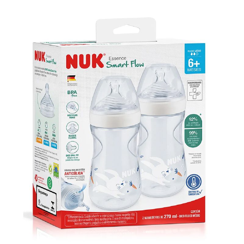 Baseado em estudos clínicos e científicos , o sistema revolucionário do bico de mamadeira da NUK Essence Smart, com tecnologia 100% desenvolvida, testada e fabricada na Alemanha, se destaca por possuir múltiplos furos que possuem alta aceitação entre as crianças pois variam em quantidade para assegurar um fluxo adequado de acordo com a consistência de cada alimento. -Tampa com função antivazamento permite a vedação total da mamadeira sem o auxílio do disco de vedação; -Formato que possui uma base ainda mais larga para oferecer maior conforto para a criança durante a alimentação; -Mantém a conhecida e admirada qualidade NUK com uso de um silicone supermacio e resistente; -Bocal Extra largo facilita a limpeza e o preparo do alimento na mamadeira; -Válvula Nuk Air System, que reduz a ingestão de ar durante a alimentação; -Frasco super-resistente, em formato anatômico e livre de BPA; Com indicador de temperatura para ajudar os pais na tarefa de assegurar a temperatura adequada dos alimentos para o consumo da criança. Idealmente, a comida para crianças deve ter a temperatura corporal (37C= Tom escuro). Se o conteúdo do frasco estiver muito quente, o indicador de temperatura ficará branco. Aguarde o indicador voltar à cor azul para oferecer a mamadeira à criança. Mamadeira 270ml: Bico: +6 meses fluxo médio 6 furos.