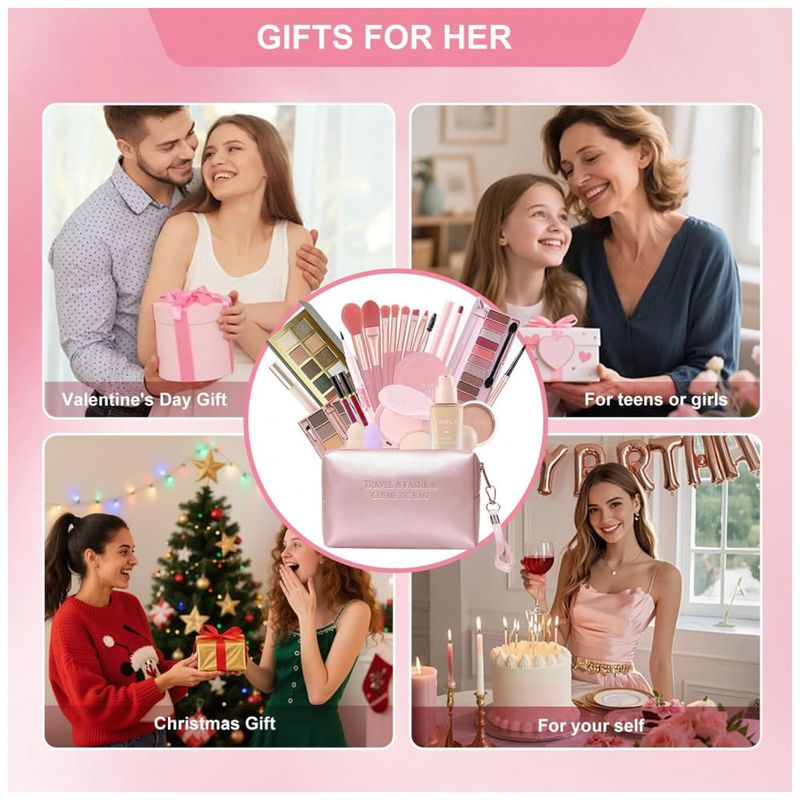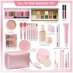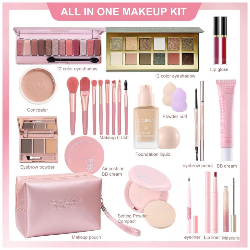 Kit maquiagem tudo em um com 25 peças Fynqwor, incluindo base, corretivo, paleta de sombras, gloss labial e acessórios para aplicação completa facial. Conjunto projetado para organização em bolsa portátil com design funcional para transporte diário ou viagens.