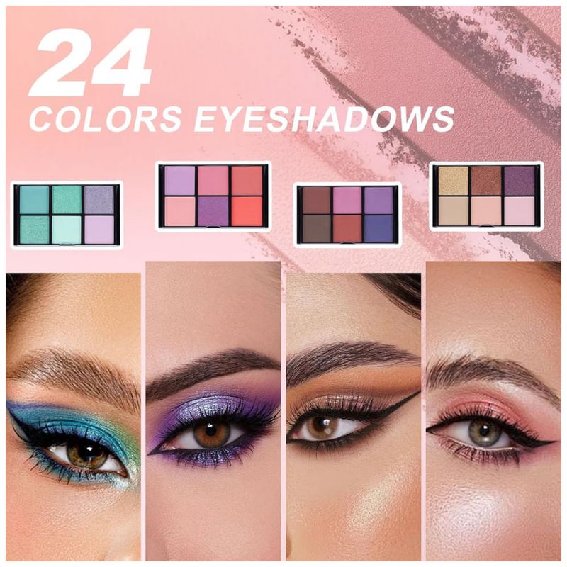 Kit maquiagem completo tudo em um Mileonaim para aplicação de looks variados, incluindo paleta de sombras com 24 cores, gloss labial, blush, iluminador e ferramentas essenciais como pincéis. Projetado para portabilidade com estojo rígido multifuncional para armazenamento e transporte de cosméticos.