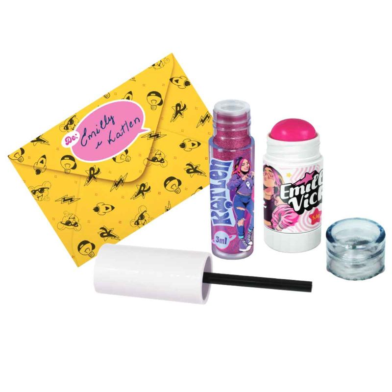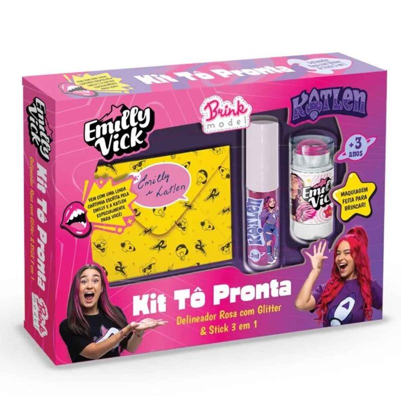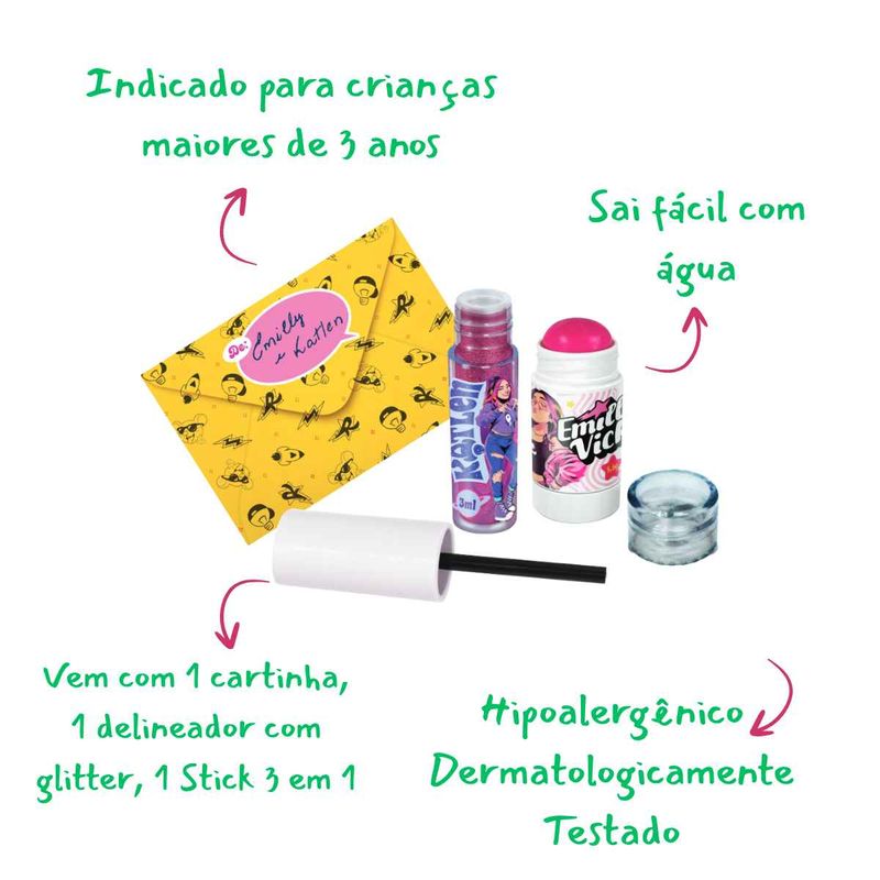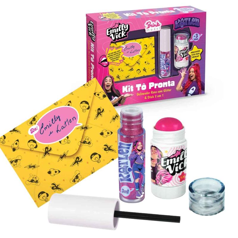 Conteúdo da embalagem: 1 delineador rosa com glitter 3mL, 1 stick 3 em 1 (batom, blush e sombra) 5,6 gramas, 1 cartinha da Emilly Vick e da Katlen