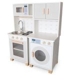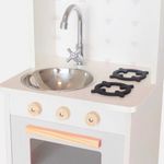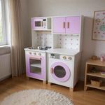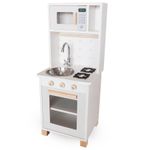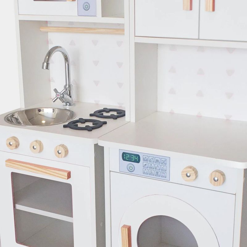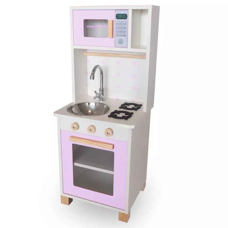 Com um lindo cooktop de 2 bocas e 3 botões que giram, pia com torneira, portas que abrem e fecham, micro-ondas e forno com visualização interna, armário com espaço para guardar os utensílios de cozinha, e porta toalha, a brincadeira fica completa!