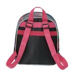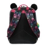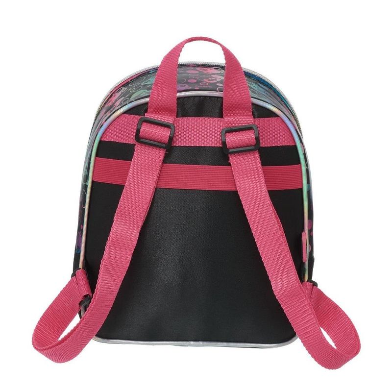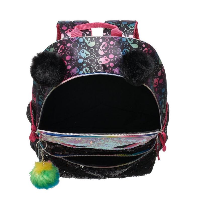 Design encantador e moderno: Mochila preta com orelhinhas de pompom, paetês brilhantes e pandinhas coloridos, garantindo um visual superfofo e cheio de estilo.