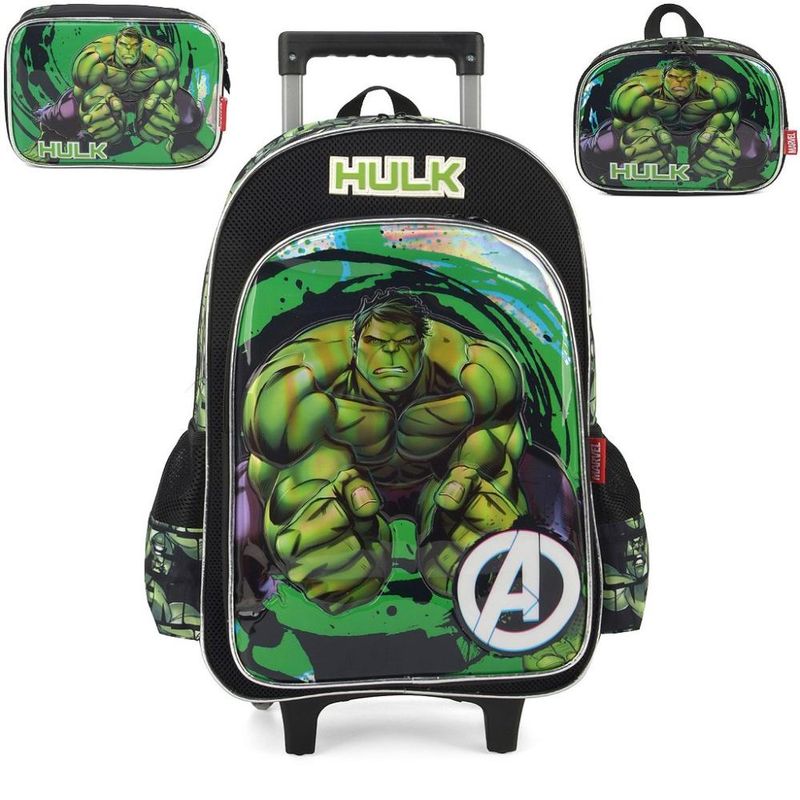 Kit Mochila de Rodinha Lancheira e Estojo Luxcel Hulk Verde