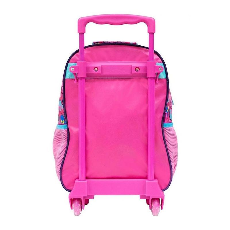 Descrição Mochila: Em tamanho 14", é produzida em poliéster resistente e estampado. Painel frontal pvc Cristal - Compartimento principal amplo, zíper compuxadores simples. Carrinho em metal com travas. dimensões: - Largura: 28cm - Altura: 40cm - Comprimento: 15cm Com puxador que atinge a altura máxima de 32 cm Descrição Lancheira: Lancheira com compartimento espaçoso com forro interno que ajuda a mantero frescor por mais tempo.alças reguláveis e faixa para acoplar o produto na haste da mala de rodinhas.