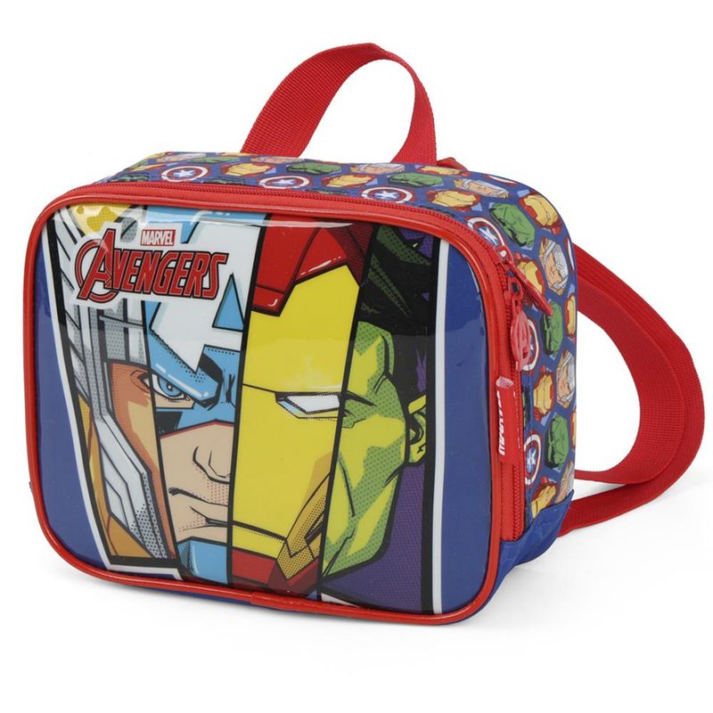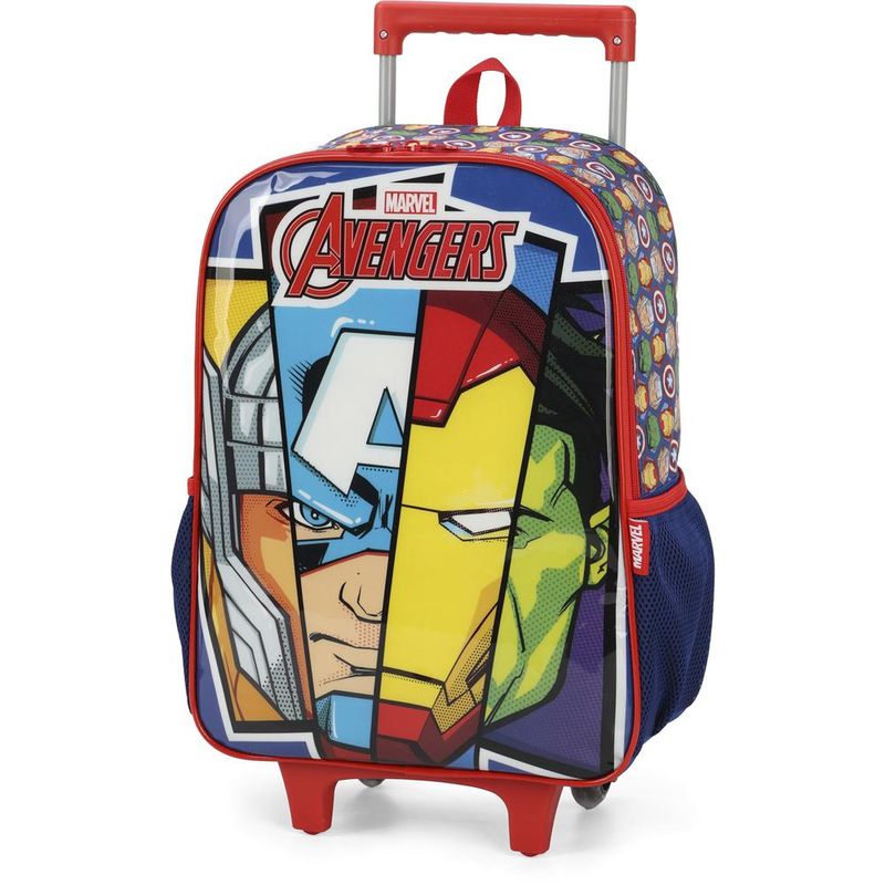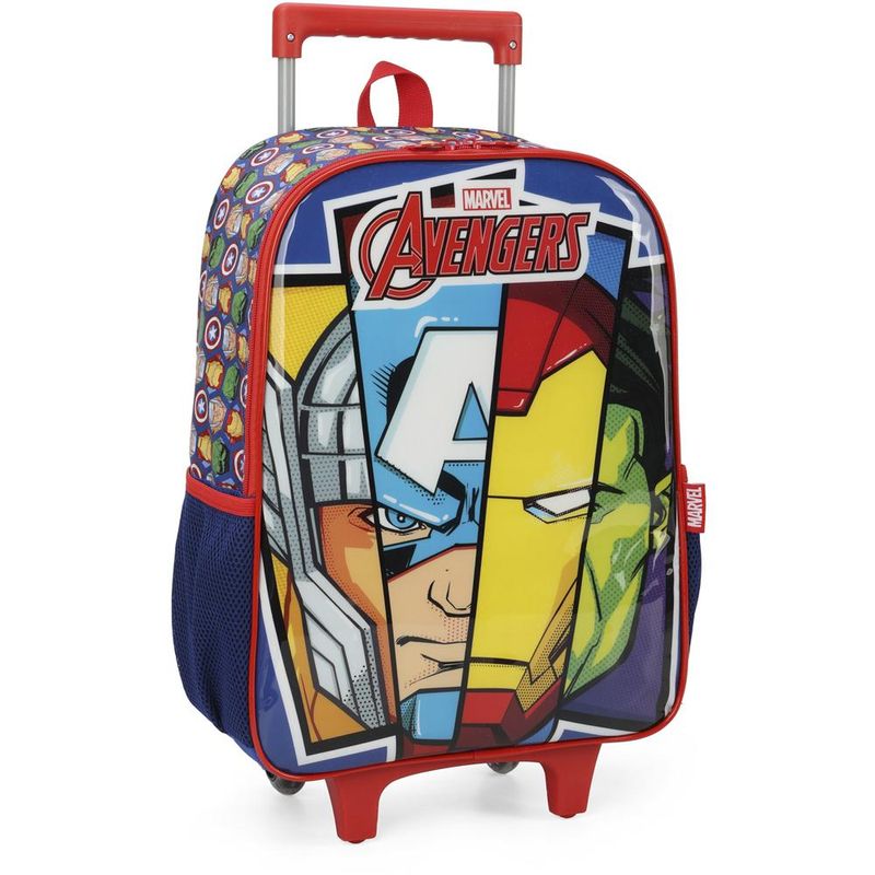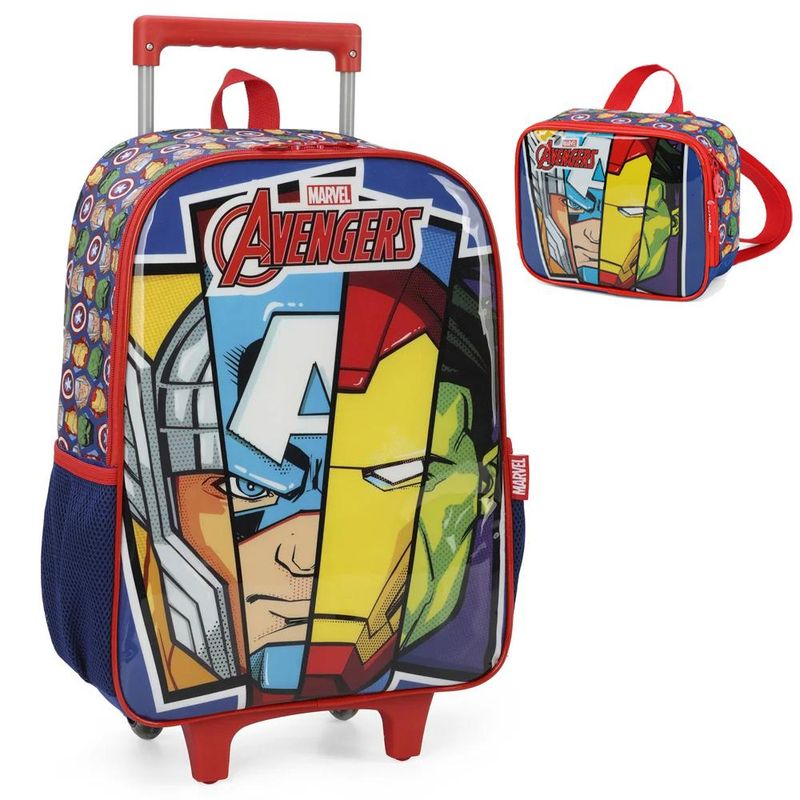 KIT MOCHILA DE RODINHAS E LANCHEIRA LUXCEL AVENGERS Kit mochila de rodinhas com bolsos laterias em tela com elástico, alças de costas espumadas e reguláveis, silk frontal, bolso frontal com zíper, alça de mão. Lancheira estampada com alça de costas e alça de mão, além de etiquetas personalizadas. Características Principais: Dimensões aproximadas: Mochila 43 x 31 x 16cm (AxLxP) / Lancheira: 23 x 19 x 10cm (LxAxP). Volume aproximado: Mochila 21 Litros / Lancheira: 4,3 Litros. Garantia contra defeito de fabricação.
