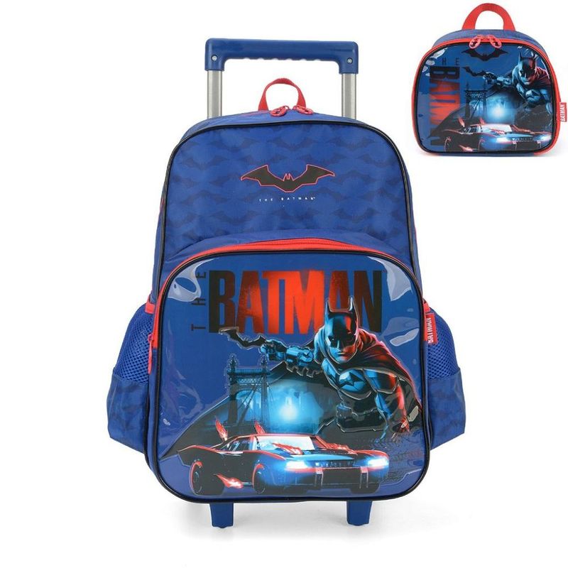 Kit Mochila de Rodinhas e Lancheira Luxcel Batman Azul Produto ideal para crianças de 4 a 10 anos que estão em séries iniciais. Kit Mochilete e Lancheira