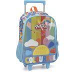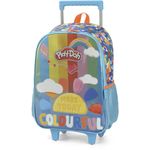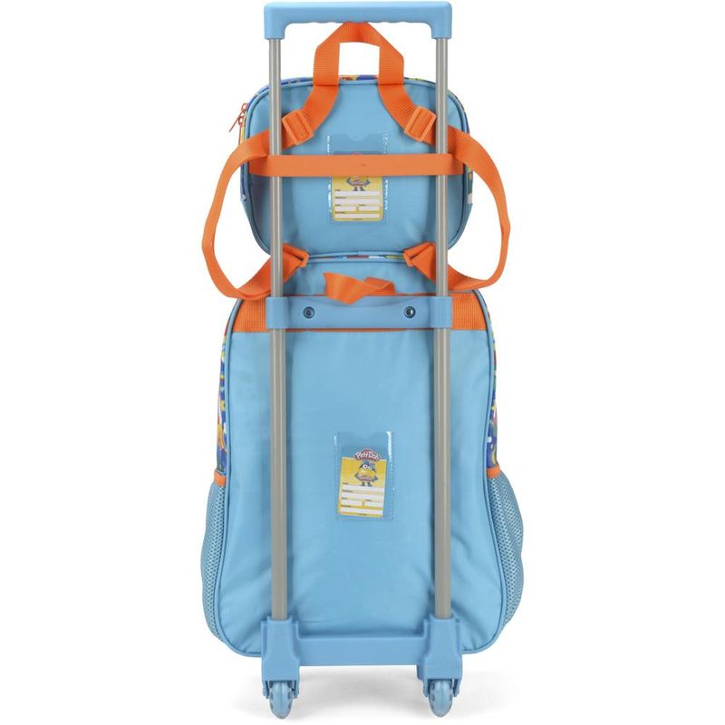 KIT MOCHILA DE RODINHAS E LANCHEIRA LUXCEL PLAY DOH Kit mochila de rodinhas com bolsos laterias em tela com elástico, alças de costas espumadas e reguláveis, silk frontal, bolso frontal com zíper, alça de mão. Lancheira estampada com alça de costas e alça de mão, além de etiquetas personalizadas. Características Principais: Dimensões aproximadas: Mochila 43 x 31 x 16cm (AxLxP) / Lancheira: 23 x 19 x 10cm (LxAxP). Volume aproximado: Mochila 21 Litros / Lancheira: 4,3 Litros. Garantia contra defeito de fabricação.