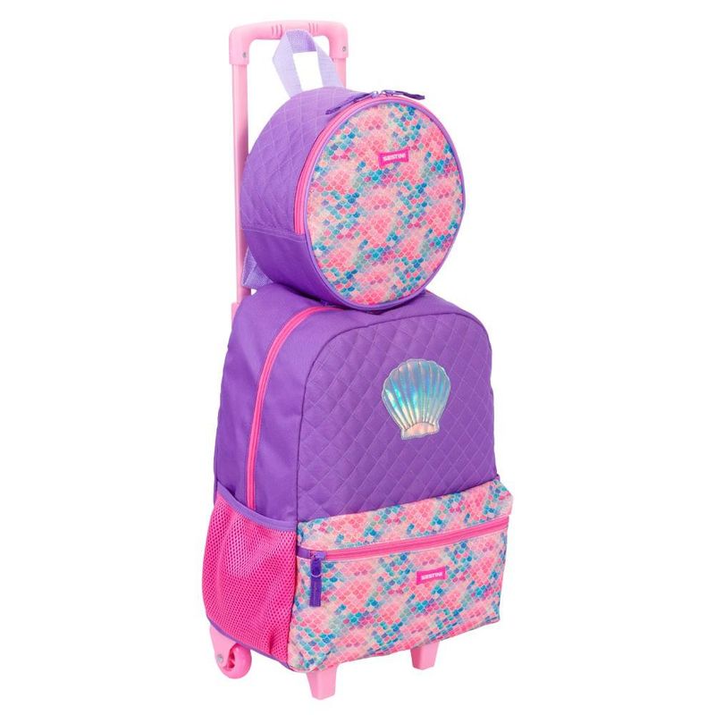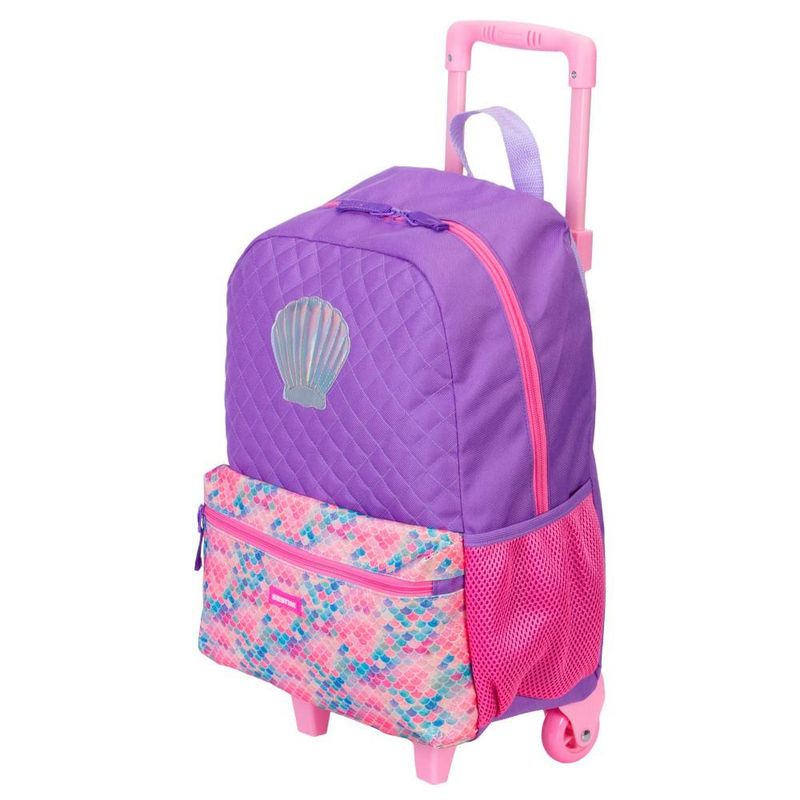 Inspirada nos elementos do fundo do mar e com a cor tendência da estação, a nova linha Sereia tem um bolso frontal colorido, com textura de glitter que lembram escamas, além de uma concha holográfica. Os puxadores do zíper tem reforço em cadarço e no compartimento principal cabe a pasta de atividades e os materiais escolares. Esta versão com carrinho, duas rodinhas e pés de apoio são fáceis de transportar. CARACTERÍSTICAS Mochila: Alça: De Mão