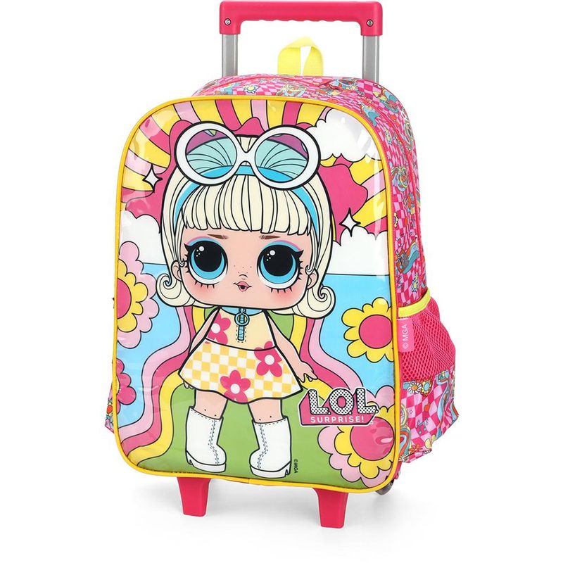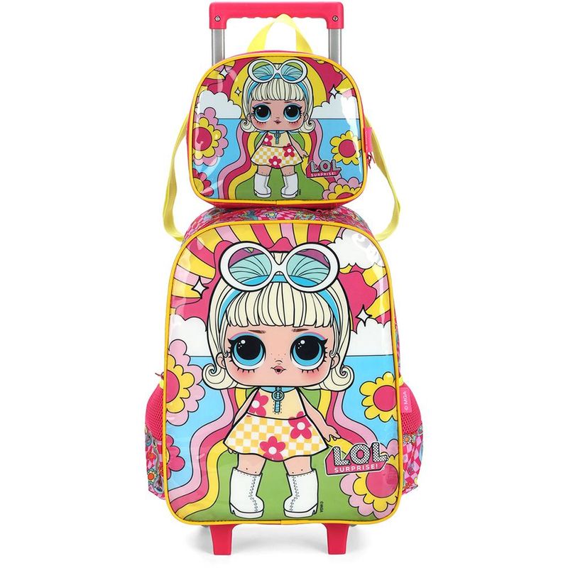 KIT MOCHILA DE RODINHAS E LANCHEIRA LUXCEL LOL SURPRISE Kit mochila de rodinhas com bolsos laterias em tela com elástico, alças de costas espumadas e reguláveis, silk frontal, bolso frontal com zíper, alça de mão. Lancheira estampada com alça de costas e alça de mão, além de etiquetas personalizadas. Características Principais: Dimensões aproximadas: Mochila 41 x 30 x 14cm (AxLxP) / Lancheira: 22 x 17 x 8cm (LxAxP). Volume aproximado: Mochila 17,5 Litros / Lancheira: 3 Litros. Garantia contra defeito de fabricação.