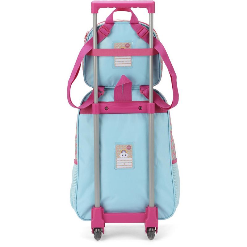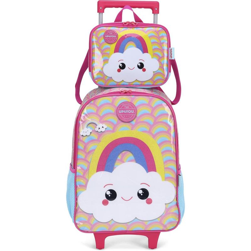 KIT MOCHILA DE RODINHAS E LANCHEIRA LUXCEL UP4YOU NUVEM Kit mochila de rodinhas com bolsos laterias em tela com elástico, alças de costas espumadas e reguláveis, silk frontal, bolso frontal com zíper, alça de mão. Lancheira estampada com alça de costas e alça de mão, além de etiquetas personalizadas. Características Principais: Dimensões aproximadas: Mochila 43 x 31 x 16cm (AxLxP) / Lancheira: 23 x 19 x 10cm (LxAxP). Volume aproximado: Mochila 21 Litros / Lancheira: 4,3 Litros. Garantia contra defeito de fabricação.