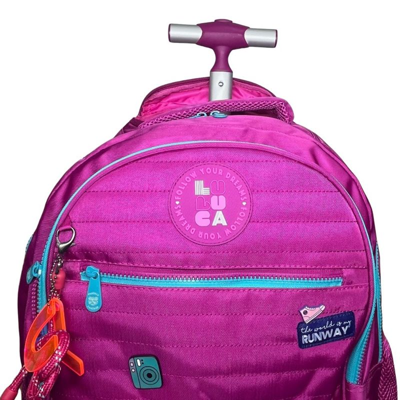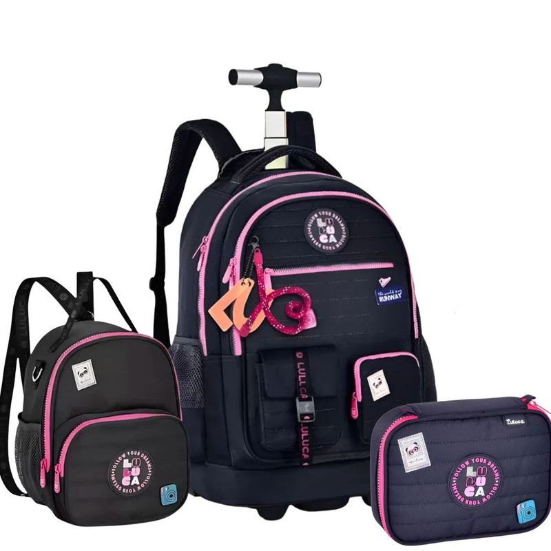 Além disso, a mochila conta com rodinhas macias, facilitando o transporte, e detalhes exclusivos como chaveiro de corda e acrílico, zíper bicolor e cadarços logados acetinados que completam o visual moderno. É muito mais que uma Mochila Escolar Luluca – é uma aliada para quem busca estilo e organização.