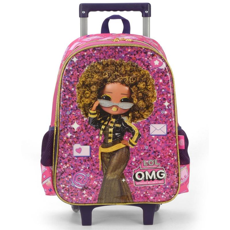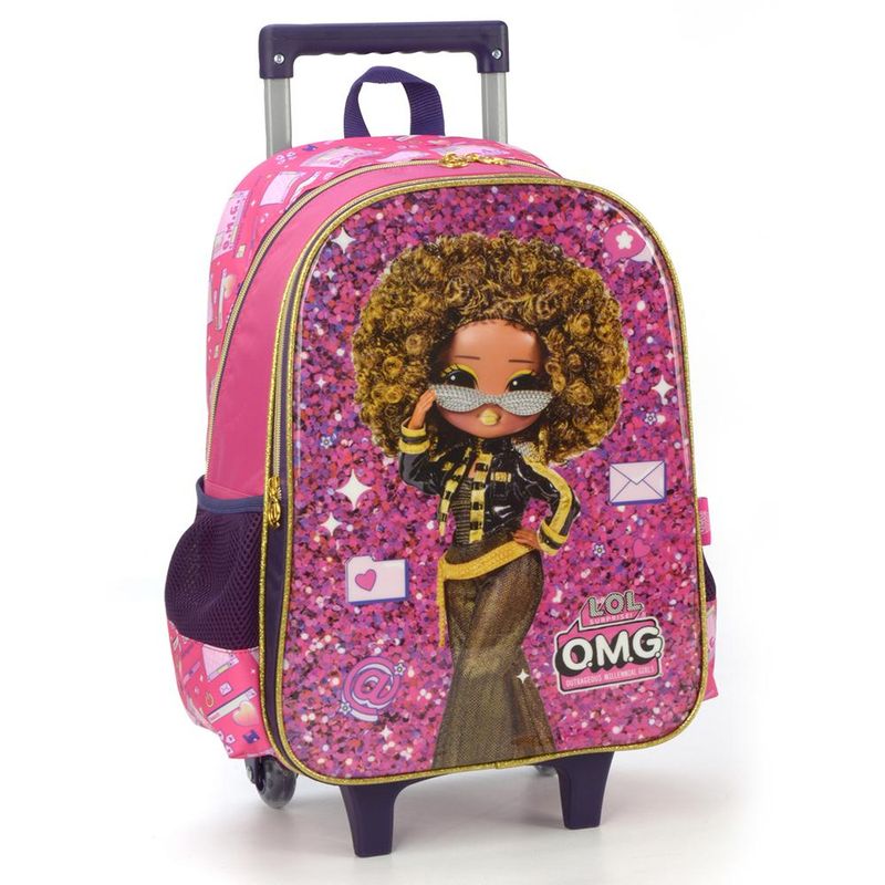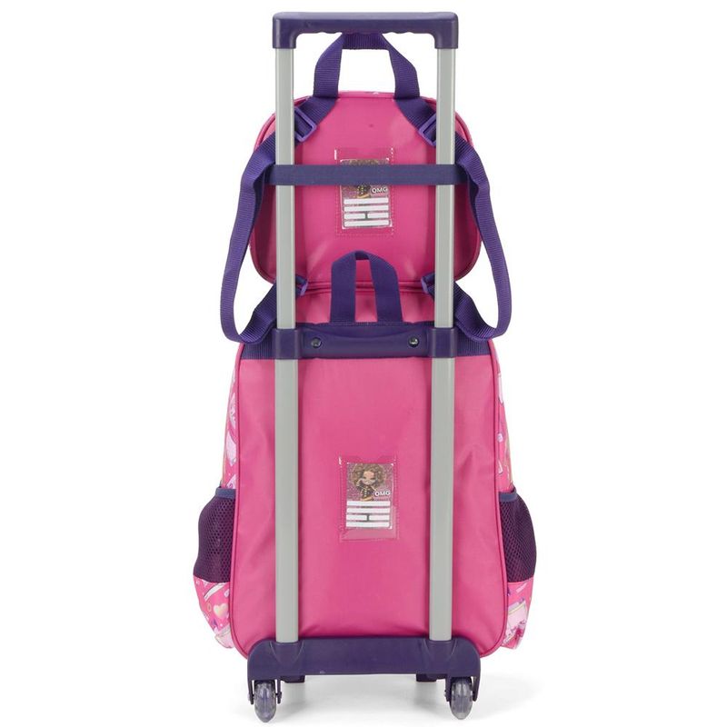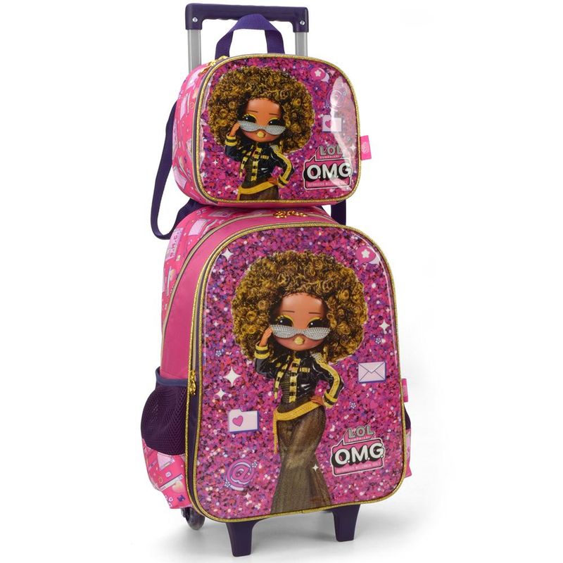 KIT MOCHILA DE RODINHAS E LANCHEIRA LUXCEL LOL OMG Kit mochila de rodinhas com bolsos laterias em tela com elástico, alças de costas espumadas e reguláveis, silk frontal, bolso frontal com zíper, alça de mão. Lancheira estampada com alça de costas e alça de mão, além de etiquetas personalizadas. Características Principais: Dimensões aproximadas: Mochila 41 x 30 x 14cm (AxLxP) / Lancheira: 23 x 17 x 8cm (LxAxP). Volume aproximado: Mochila 17,5 Litros / Lancheira: 3,2 Litros. Garantia contra defeito de fabricação.