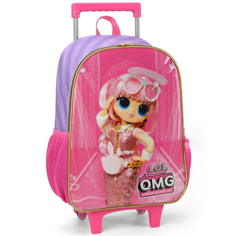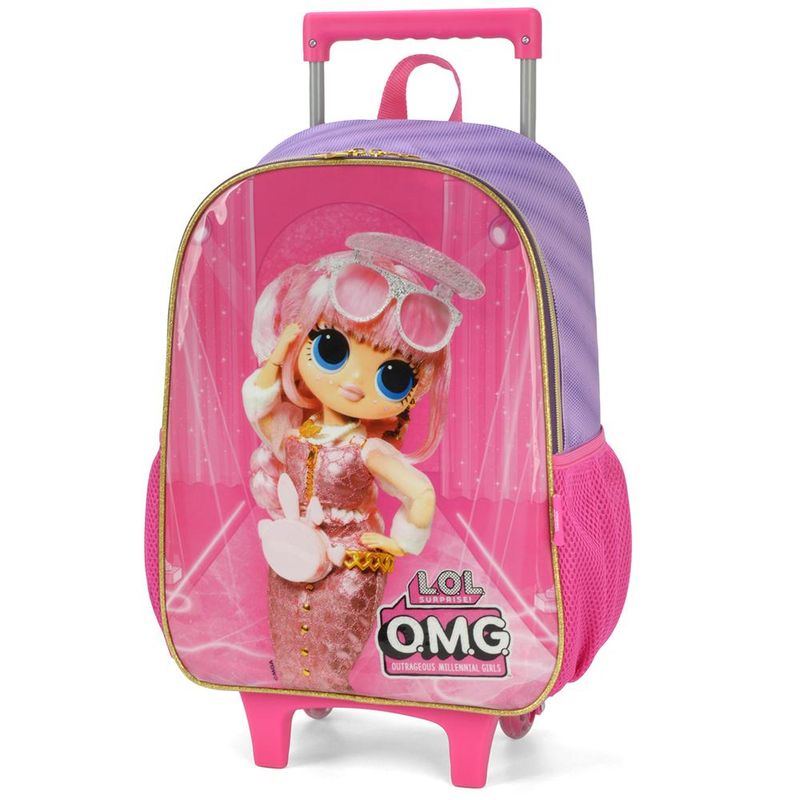 KIT MOCHILA DE RODINHAS E LANCHEIRA LUXCEL LOL OMG Kit mochila de rodinhas com bolsos laterias em tela com elástico, alças de costas espumadas e reguláveis, silk frontal, bolso frontal com zíper, alça de mão. Lancheira estampada com alça de costas e alça de mão, além de etiquetas personalizadas. Características Principais: Dimensões aproximadas: Mochila 41 x 30 x 14cm (AxLxP) / Lancheira: 23 x 17 x 8cm (LxAxP). Volume aproximado: Mochila 17,5 Litros / Lancheira: 3,2 Litros. Garantia contra defeito de fabricação.