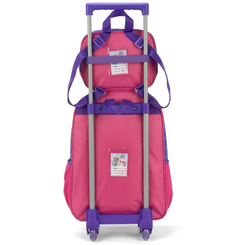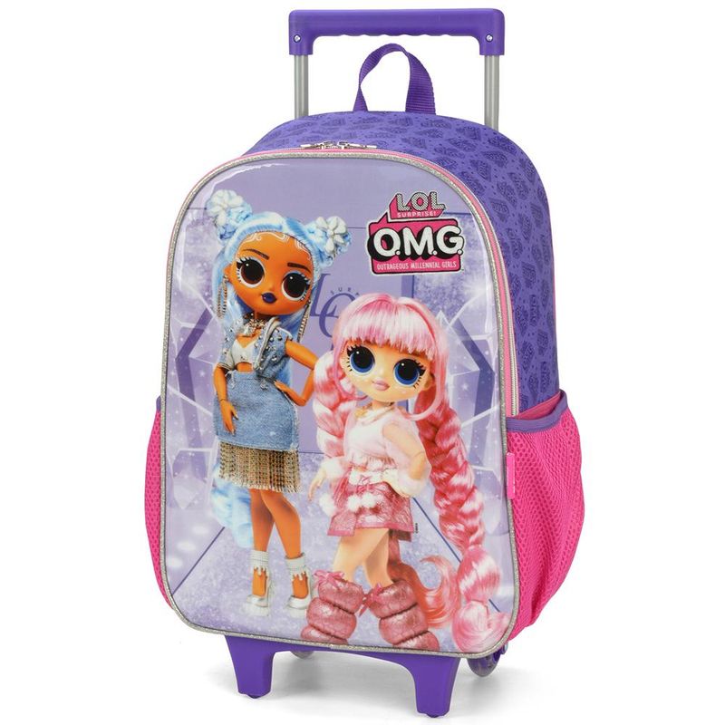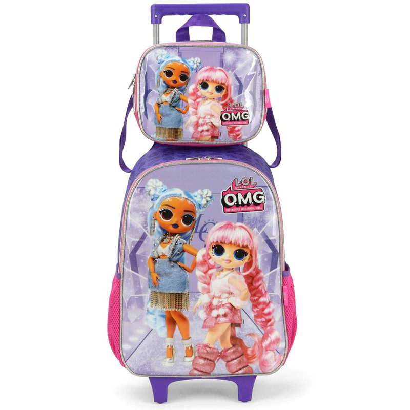 KIT MOCHILA DE RODINHAS E LANCHEIRA LUXCEL LOL OMG Kit mochila de rodinhas com bolsos laterias em tela com elástico, alças de costas espumadas e reguláveis, silk frontal, bolso frontal com zíper, alça de mão. Lancheira estampada com alça de costas e alça de mão, além de etiquetas personalizadas. Características Principais: Dimensões aproximadas: Mochila 41 x 30 x 14cm (AxLxP) / Lancheira: 23 x 17 x 8cm (LxAxP). Volume aproximado: Mochila 17,5 Litros / Lancheira: 3,2 Litros. Garantia contra defeito de fabricação.