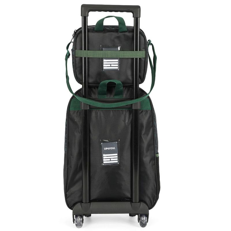 KIT MOCHILA DE RODINHAS E LANCHEIRA LUXCEL Kit mochila de rodinhas com bolsos laterias em tela com elástico, não possui alças de costas, silk frontal, alça de mão. Lancheira estampada com alça de costas e alça de mão, além de etiquetas personalizadas. Características Principais: Dimensões aproximadas: Mochila 41 x 30 x 14cm (AxLxP) / Lancheira: 22 x 17 x 8cm (LxAxP). Volume aproximado: Mochila 21 Litros / Lancheira: 4,3 Litros. Garantia contra defeito de fabricação.