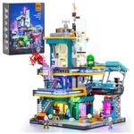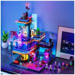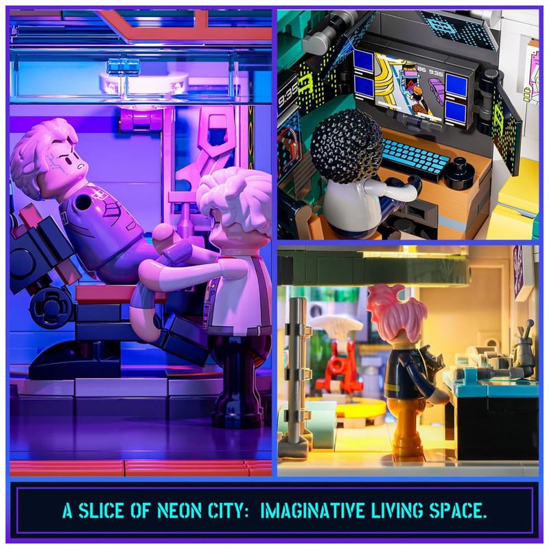 Conjunto de blocos de montar em plástico que representa um edifício residencial futurista em estilo cyberpunk, com múltiplos níveis, passarelas, letreiros e painéis em tons de azul e roxo. A construção simula apartamentos em um quarteirão de cidade do futuro, com fachadas cheias de tubulações aparentes, placas luminosas e módulos externos.?