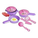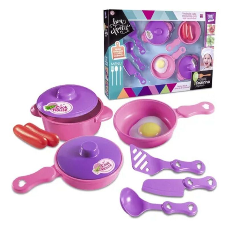 Uma brincadeira de dar água na boca!Com este kit de cozinha as brincadeiras ficarão completas.Com 9 peças Vem com 4 panelas + 3 utensílios + 2 comidinhas para você preparar as mais deliciosas receitas.