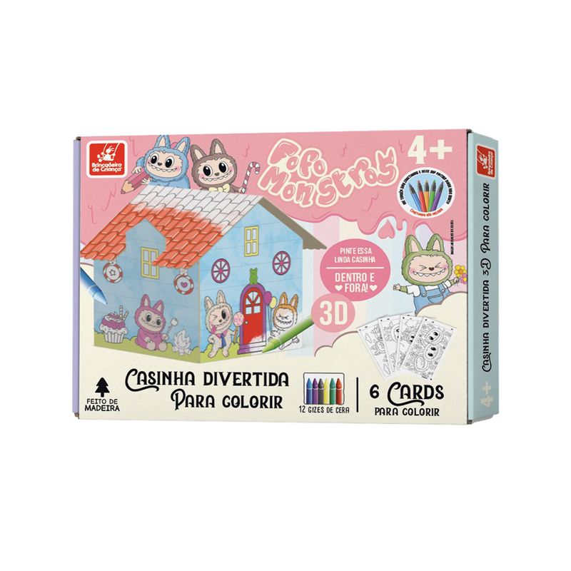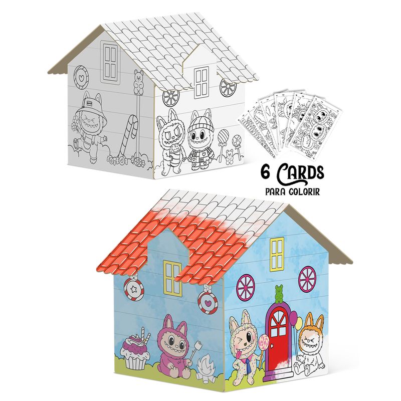 Inspirado no viral do TikTok, uma forma divertida de desenvolver e despertar a criatividade dos pequenos com esse kit com casinha divertida 3D para colorir, giz de cera e 6 cards.