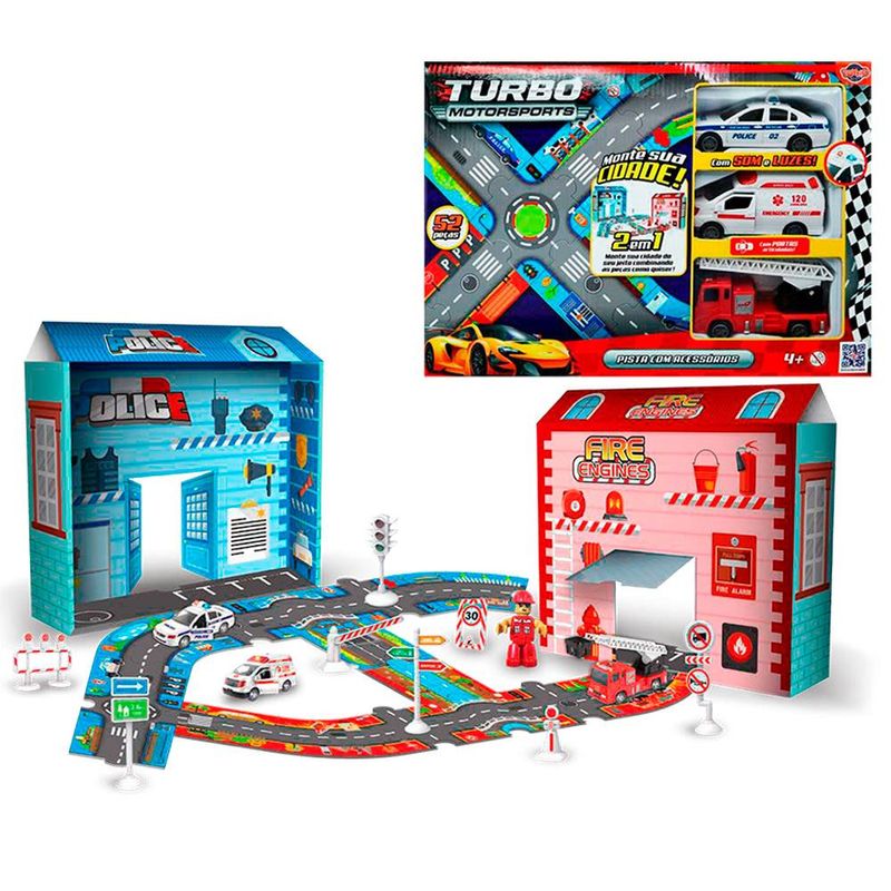 O Kit Pista Turbo Motorsports da Toyng vem com 3 veículos resgate: Policial, Ambulância e Bombeiro que emite som. Conta ainda com um boneco, semáforo e sinalizadores com pista de montar. A diversão está garantida!