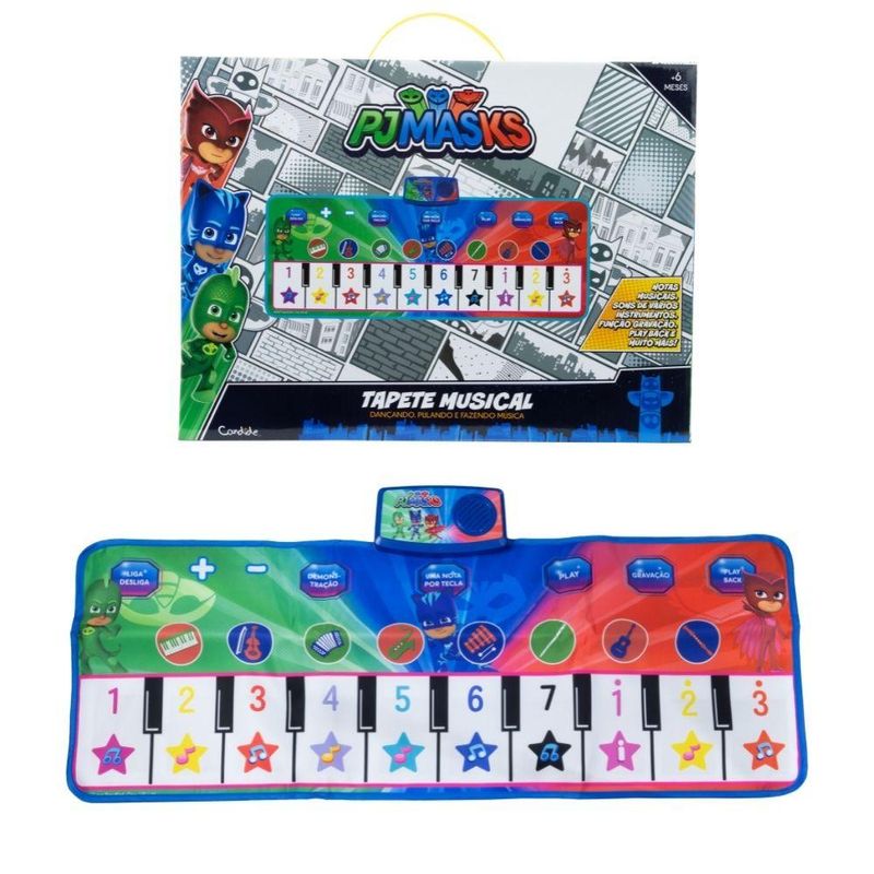 • A Corujita, o Largatixo e o Menino Gato estão em uma divertida missão! Você pode aprender brincando com o laptop do PJ Masks! Este incrível laptop infantil é bilíngue (português e inglês) e possui diversos grupos de atividades, como: soma e divisão, perguntas e respostas, letras, palavras, ortografia e música! A brincadeira vai ficar muito mais divertida com seus heróis favoritos! • Com o Tapete Piano PJ Masks você poderá ser o artista do seu show! Além de compartilhar esse divertido momento com o Menino Gato, a Corujita e o Lagartixo! O tapete tem 8 músicas, diferentes sons, 19 teclas de piano e ainda um jogo de perguntas! Quem será que vai ganhar o jogo? Você, o Menino Gato, a Corujita ou o Lagartixo? A brincadeira vai ficar muito mais animada com este Tapete Piano da PJ Masks!