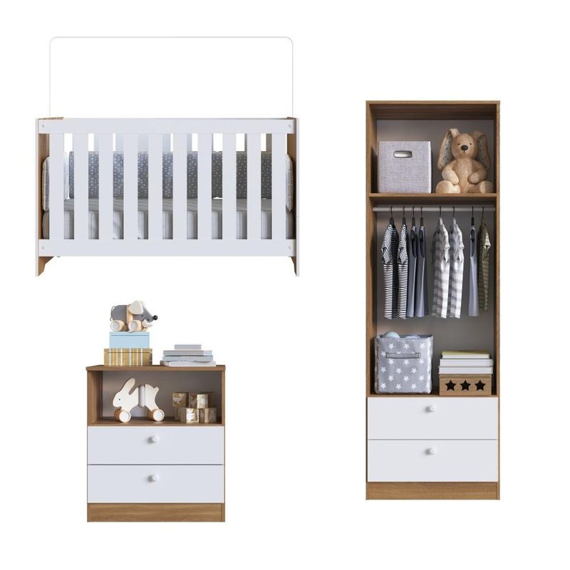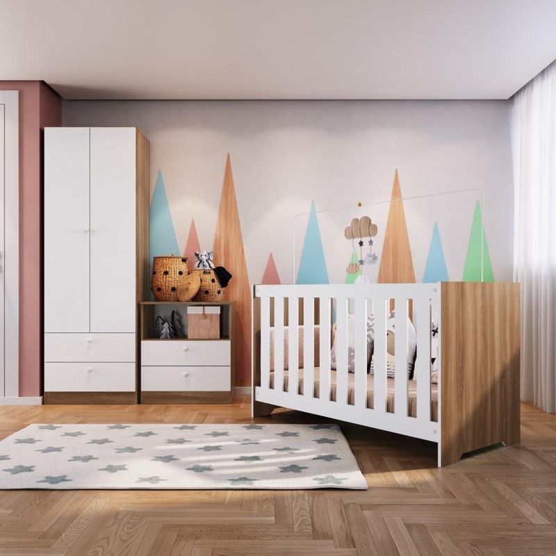 Conjunto de móveis para quarto infantil com ótimo custo-benefício composto por Berço 3 em 1, Colchão, Cômoda e Guarda Roupa de 2 portas e 2 gavetas. O Berço 3 em 1 com Rodízios e com Colchão Linha Aconchego da Completa Móveis é versátil, prático e elegante, com características que o destacam. Ideal para seu bebê, possui três opções para regulagem de altura do colchão! O Berço 3 em 1, é possível ser transformado em um mini sofá ou então em uma cama infantil. Acompanha colchão e suporte de mosquiteiro. A Cômoda de 2 Gavetas com Nicho da apoio para a troca do bebê. O Guarda Roupas Pequeno, com 2 Portas e 2 Gavetas contêm gavetas e prateleiras que facilitam e otimizam o espaço e aconchego para o ambiente, assim, acomodando e organizando as roupinhas e acessórios do dia a dia. Cabideiro incluso.