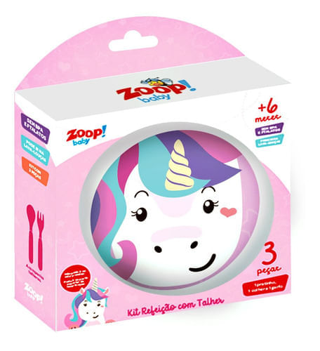 Kit Refeição com Talher - 3 Peças Unicórnio Rosa da Zoop Toys.
