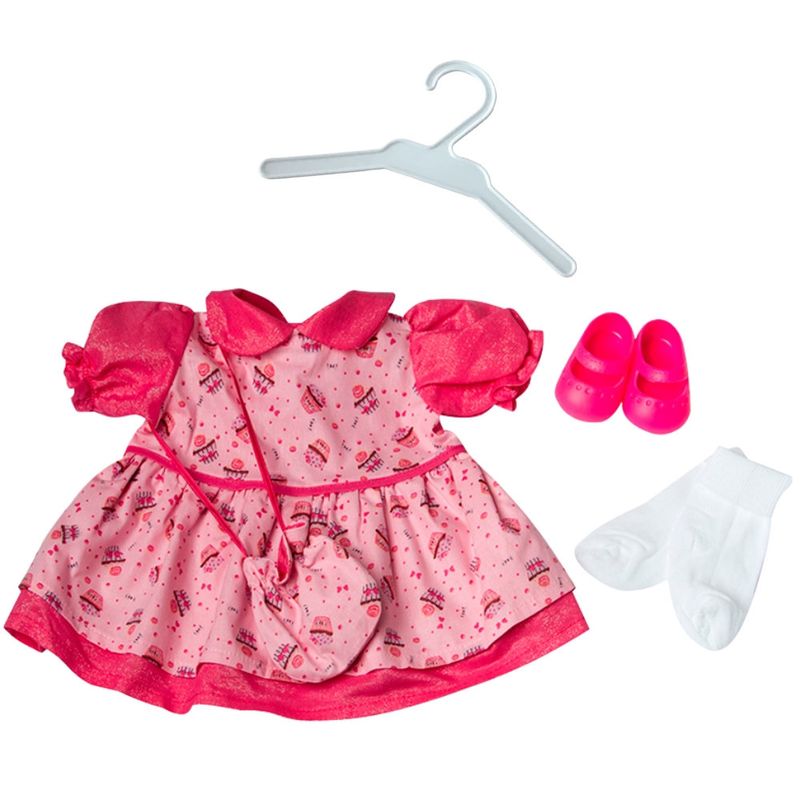 KIT CONTÉM: 01 VESTIDO SAIA DUPLA COM BRILHO NA SAIA, MANGA E GOLA, 01 BOLSINHA, 01 MEIA SOQUETE BRANCA, 01 PAR DE SAPATILHAS SOLA 07CM PINK E 01 CABIDE