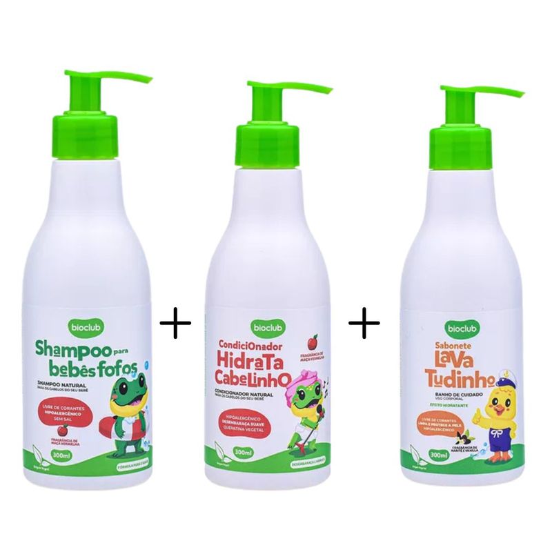 kit com 01 shampoo, 01 condicionador e 01 sabonete Natural Infantil da Bioclub