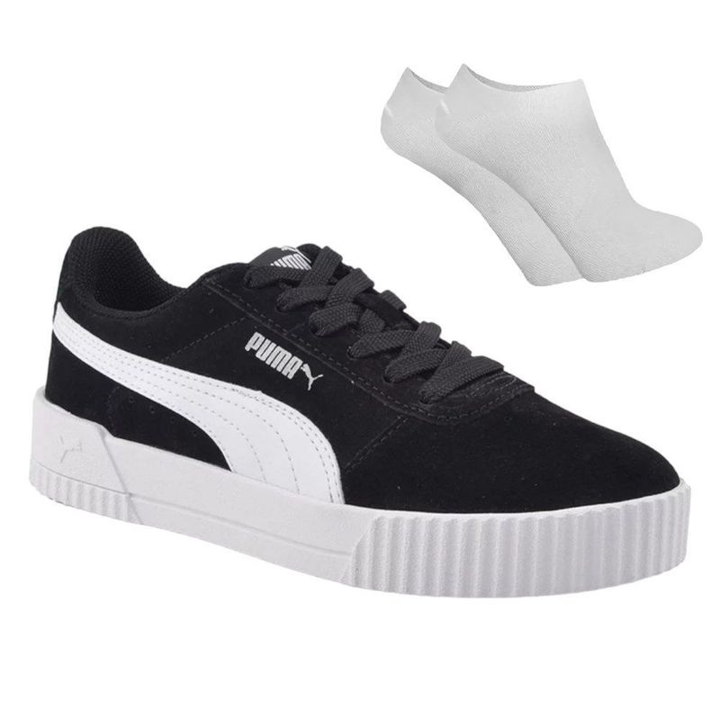 Com o Tênis Puma Carina BDP Feminino seu visual esportivo casual ganha classe e estilo. O modelo possui cabedal em camurça, oferecendo uma textura macia e confortável. O interior forrado e acolchoado conta com palmilha com tecnologia Softfoam que prolonga a sensação de conforto. O fechamento por cadarço promove melhor ajuste. Conta ainda com solado em borracha para maior aderência em diversos tipos de superfícies. Design em preto com a icônica faixa da Puma nas laterais e detalhes em branco. Já as meias, são confeccionadas em algodão, poliamida e elastano, além de gerar comodidade, elas se ajustam perfeitamente aos pés. O modelo sapatilha com barra elástica canelada proporciona segurança para não descer. Além disso, o calcanhar e as pontas, possuem costura com reforço garantindo a durabilidade. O tamanho da meia acompanha a numeração do tênis. Referência do tênis: 375564.