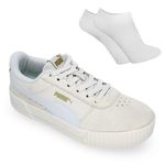 Trazemos para você o Tênis Puma Carina BDP Feminino de design impecável com tecnologia avançada. Apresentamos o modelo perfeito para um look casual e elegante, com cabedal em camurça e sintético, solado e entressola em borracha e fecho em cadarço. Sua palmilha é removível, que proporciona ainda mais conforto e facilidade na hora de higienizar. Além disso, o forro têxtil garante uma sensação agradável ao vestir o sapato, tornando-o ideal para ser utilizado por longas temporadas. O diferencial deste sapato é a tecnologia SoftFoam, uma espuma que se molda anatomicamente ao pé, oferecendo uma experiência de suavidade e conforto incomparáveis. Com essa tecnologia, você pode utilizá-lo por horas a fio, sem perder o bem-estar. Além disso, o SoftFoam minimiza a retenção de calor, mantendo seus pés protegidos e frescos durante todo o dia. Com um design moderno, nas cores bege e branco, esse calçado é perfeito para completar seu visual em qualquer ocasião casual. Já as meias, são confeccionadas em algodão, poliamida e elastano, além de gerar comodidade, elas se ajustam perfeitamente aos pés. O modelo sapatilha com barra elástica canelada proporciona segurança para não descer. Além disso, o calcanhar e as pontas, possuem costura com reforço garantindo a durabilidade. O tamanho da meia acompanha a numeração do tênis. Referência: 375564.57
