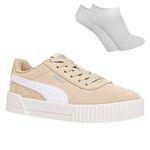 Trazemos para você o Tênis Puma Carina BDP Feminino de design impecável com tecnologia avançada. Apresentamos o modelo perfeito para um look casual e elegante, com cabedal em camurça e sintético, solado e entressola em borracha e fecho em cadarço. Sua palmilha é removível, que proporciona ainda mais conforto e facilidade na hora de higienizar. Além disso, o forro têxtil garante uma sensação agradável ao vestir o sapato, tornando-o ideal para ser utilizado por longas temporadas. O diferencial deste sapato é a tecnologia SoftFoam, uma espuma que se molda anatomicamente ao pé, oferecendo uma experiência de suavidade e conforto incomparáveis. Com essa tecnologia, você pode utilizá-lo por horas a fio, sem perder o bem-estar. Além disso, o SoftFoam minimiza a retenção de calor, mantendo seus pés protegidos e frescos durante todo o dia. Com um design moderno, nas cores bege e branco, esse calçado é perfeito para completar seu visual em qualquer ocasião casual. Já as meias, são confeccionadas em algodão, poliamida e elastano, além de gerar comodidade, elas se ajustam perfeitamente aos pés. O modelo sapatilha com barra elástica canelada proporciona segurança para não descer. Além disso, o calcanhar e as pontas, possuem costura com reforço garantindo a durabilidade. Referência: 37556455.