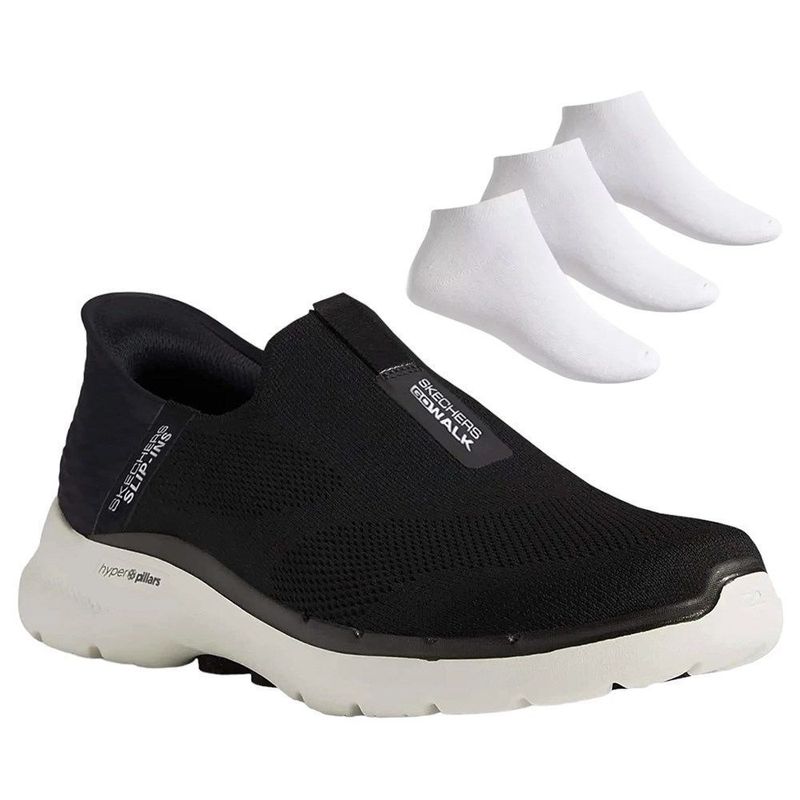 O kit tênis Skechers Go Walk 6 Easy On + 3 pares de meias é uma excelente opção para homens que buscam um calçado prático e confortável para atividades físicas ou para o dia a dia. Seu cabedal em mesh é respirável e proporciona uma ótima ventilação aos pés, mantendo-os frescos e secos durante o uso. A entressola Hyper Pilars oferece amortecimento e suporte aos pés, garantindo conforto e segurança durante as atividades físicas. O solado em EVA é resistente e flexível, proporcionando aderência em diferentes superfícies. Com a tecnologia Slip-Ins, o tênis pode ser facilmente calçado e descalçado, o que o torna uma ótima opção para quem tem uma rotina agitada. As palmilhas removíveis Air Cooled Memory Foam oferecem ainda mais conforto ao tênis, se adaptando à forma dos pés e absorvendo o impacto das pisadas. Com um design moderno e esportivo, o Skechers Go Walk 6 Easy On é a pedida certa para acompanhar sua rotina de atividades físicas. Referência: 216278-BLK. Já as meias, por sua vez, são fabricadas em algodão e poliamida, garantindo ótima durabilidade e frescor aos pés. Possui cano médio, aumentando sua proteção, além de trazer reforço no calcanhar. Referência: 47950.