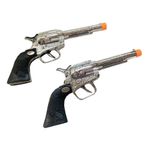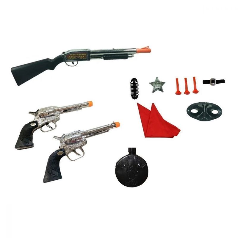 Com esse super kit a brincadeira ficará ainda mais divertida. Com um design único e com a ponta em laranja, a espingarda e os revólveres de brinquedo, atraem ainda mais a atenção para a brincadeira. Acompanha uma estrela de xerife, uma máscara, e vários outros acessórios. Acompanha três dardos com ventosa para lançar com a espingarda. A diversão é garantida!