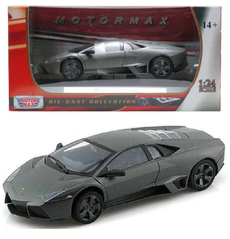 Lamborghini ReventonMarca do produto: Motormax.Escala: 1/24 (aproximadamente 19 cm de comprimento).Pneus de Borracha.Abre as Portas e Tampa Traseira.Acompanha base expositora com nome da miniatura.Miniatura em Metal com partes de plástico.