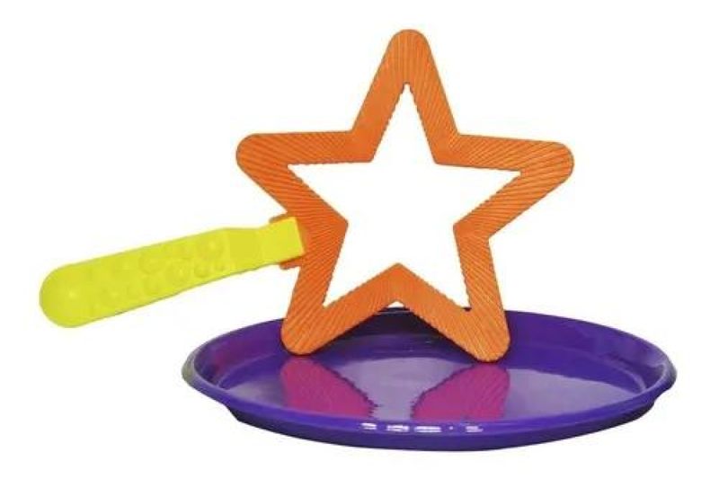 Lançador de bolhas manual em formato de estrela ou círculo que lança bolhas gigantes. Para uma brincadeira muito mais divertida! Vem com frasco de solução para bolhas.