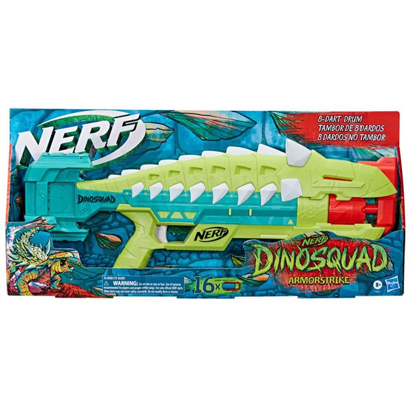 O Lançador de Dardos Nerf Dinosquad Armorstrike possui um design do cabo de apoio proporciona lançamentos mais estáveis e inclui dardos oficiais Nerf Elite, sendo 8 dardos para inserir no tambor giratório e 8 dardos adicionais para facilitar a recarga na brincadeira.