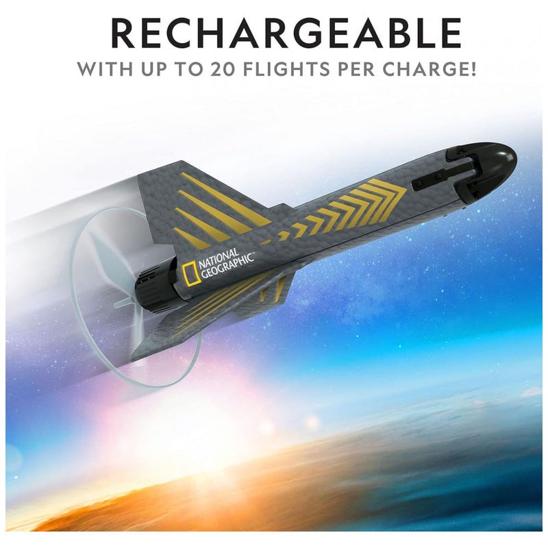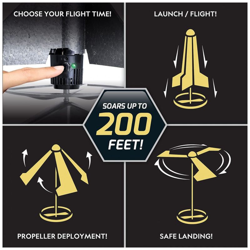 FÁCIL DE VOAR COM POUSO O design inovador inclui pás de rotor semelhantes a helicópteros que se estendem e devolvem com segurança seu foguete motorizado ao solo.