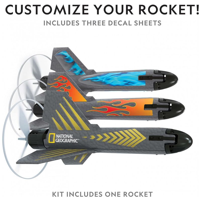 TUDO O QUE VOCÊ PRECISA PARA LANÇAR Este emocionante brinquedo infantil ao ar livre inclui plataforma de lançamento, cabo de carregamento e decalques para crianças para dar uma aparência personalizada ao seu foguete elétrico.