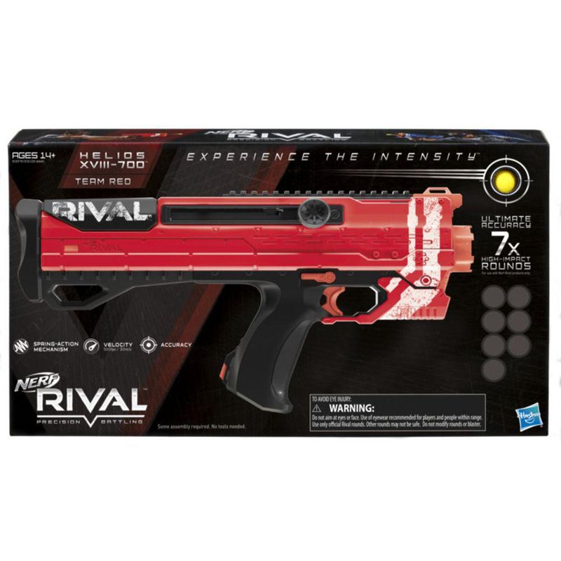 Experimente a suprema precisão e potência do Lançador de Dardos - Nerf - Rival - +14 - Helios XVIII 700 - Hasbro numa intensa competição com seus amigos As aventuras Nef Rival jamais serão as mesmas! Basta deslizar o pino para preparar o Lançador de Dardos - Nerf - Rival - +14 - Helios XVIII 700 da Hasbro e lançar projéteis a até 30 m/s! O lançador é facilmente recarregável, possui um clip para 7 projéteis e vem com 7 projéteis de alto impacto. Este lançador Nerf Rival possui trava e trilho tático. Vem com bandeiras das equipes azul e vermelha. Muitas aventuras aguardam com o lançador Nerf Rival Phantom Corps Helios XVIII-7500! Recomendações Este modelo é indicado para maiores de 14 anos de idade Não apontar para os olhos ou rosto. Recomenda-se aos jogadores e pessoas próximas o uso de óculos. Usar somente projéteis oficiais Rival. Outros projéteis podem não ser seguros. Não modificar os projéteis ou o lançador.